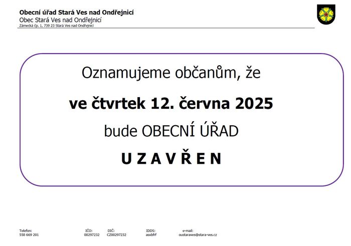 Oznamujeme, že ve čtvrtek 12. 6. 2025 bude obecní úřad uzavřen.