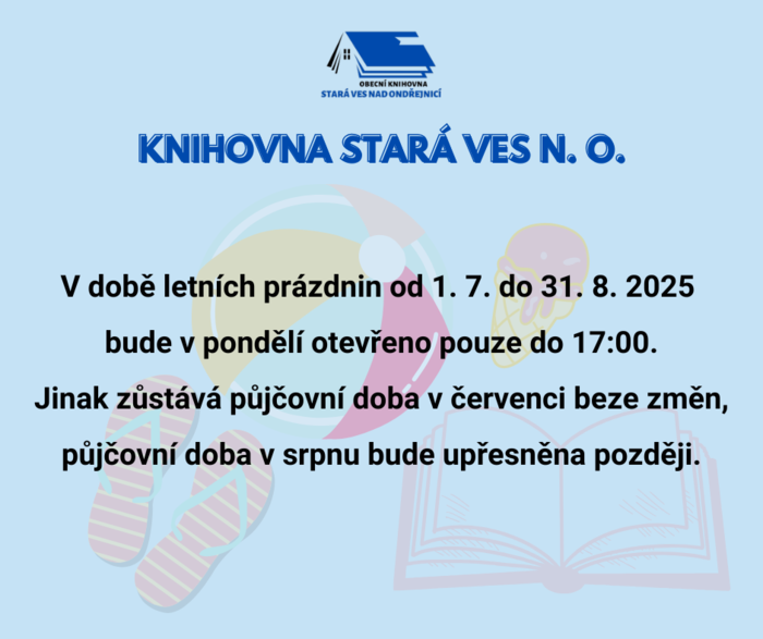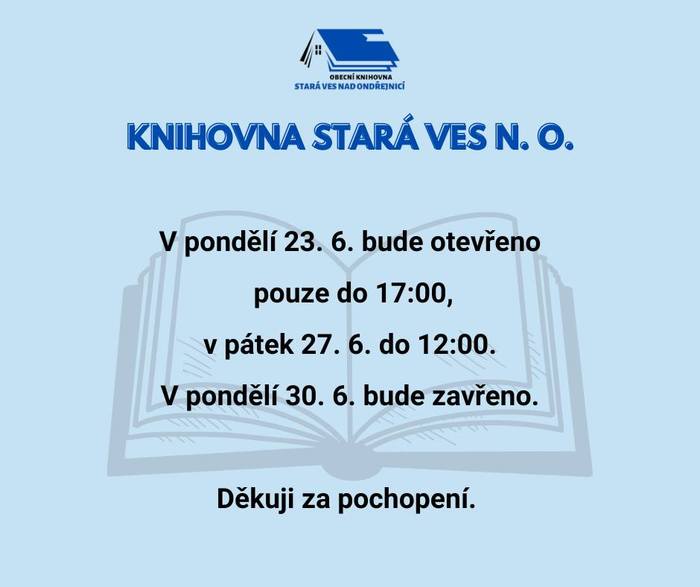 V pondělí 30. 6. 2025 bude obecní knihovna Stará Ves z důvodu čerpání dovolené uzavřena. Na čtvrtek a pátek 3. a 4. 7. 2025 je zajištěn zástup. Od pondělí 7. 7. 2025 prázdninová půjčovní doba - pondělky pouze do 17:00, jinak beze změn.