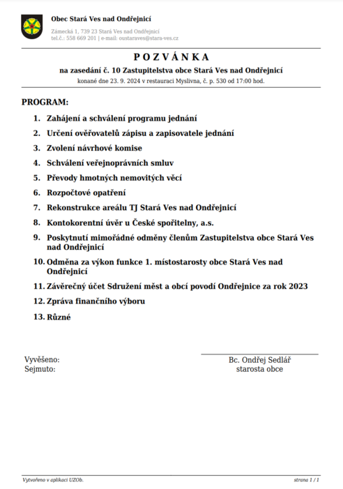 10. zasedání Zastupitelstva obce Stará Ves nad Ondřejnicí se koná v pondělí 23. 9. 2024 v 17.00 v restauraci Myslivna, č.p. 530.