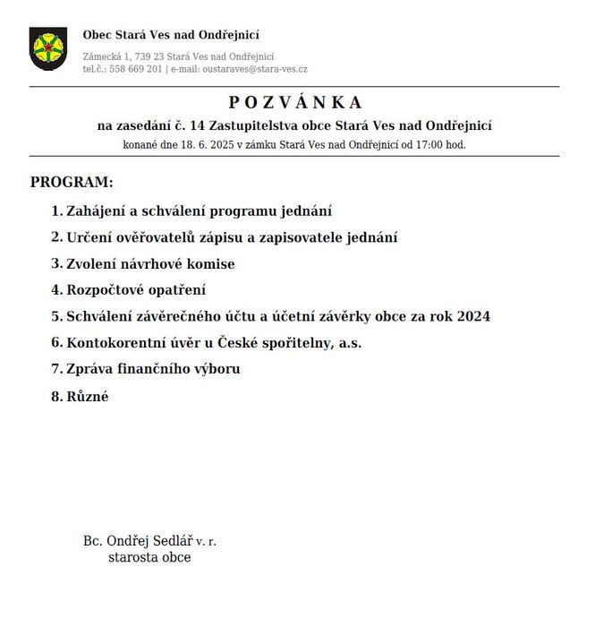 POZVÁNKA na 14. zasedání Zastupitelstva obce Stará Ves nad Ondřejnicí