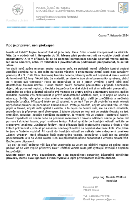 Preventivní článek oddělení prevence Krajského ředitelství policie Moravskoslezského kraje, vztahující se k povinnostem řidiče motorových vozidel v zimním období.