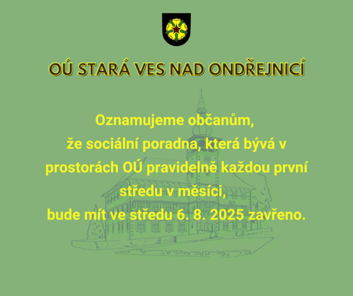 Oznamujeme, že sociální poradna v prostorách OÚ, která bývá občanům k dispozici pravidelně každou první středu v měsíci, bude mít ve středu 6. 8. 2025 zavřeno.