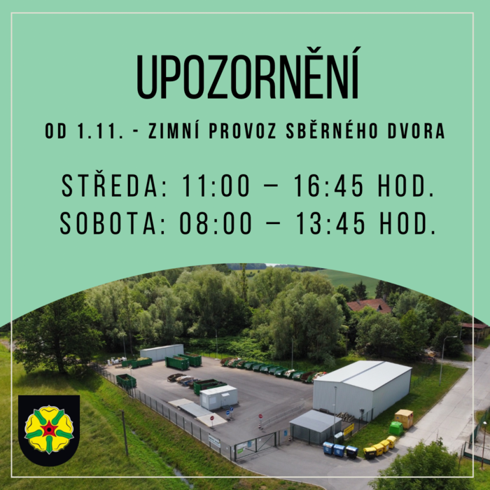 Upozorňujeme občany, že od 1. 11. 2024 do 31. 3. 2025 bude sběrný dvůr v zimním provozu - kratší otevírací doba.
