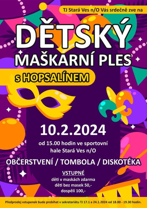 TJ Stará Ves nad Ondřejnicí Vás srdečně zve na Dětský maškarní ples s Hopsalínem 10. 2. 2024 od 15:00 ve sportovní hale.