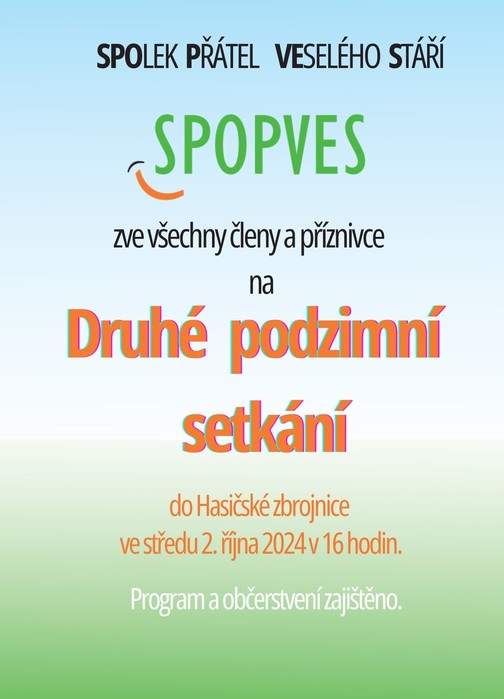 SPOlek Přátel VEselého Stáří SPOPVES zve všechny členy a příznivce na Druhé podzimní setkání do hasičské zbrojnice ve středu 2. 10. 2024 v 16 hodin.