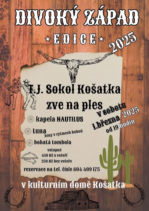 TJ Sokol Košatka zve na ples DIVOKÝ ZÁPAD 2025 v sobotu 1. 3. 2025 od 19 hodin v KD Košatka.