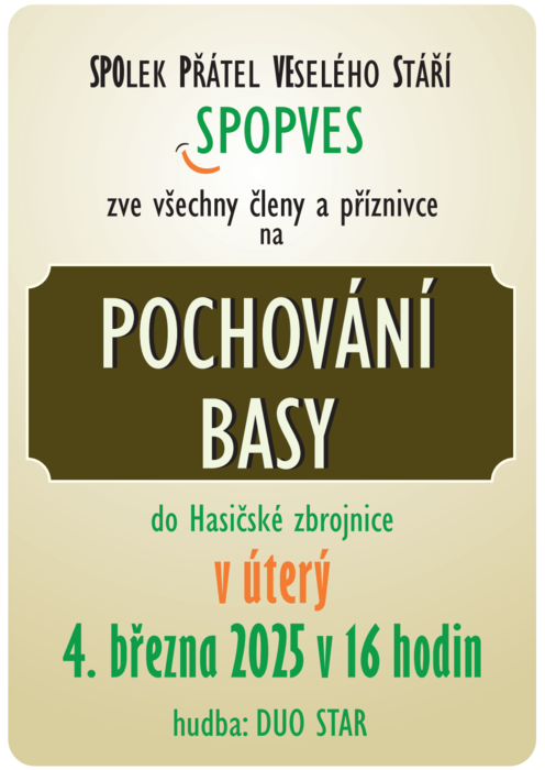 SPOlek Přátel VEselého Stáří SPOPVES zve všechny členy a příznivce na POCHOVÁNÍ BASY do hasičské zbrojnice ve Staré Vsi v úterý 4. 3. 2025 v 16 hodin.