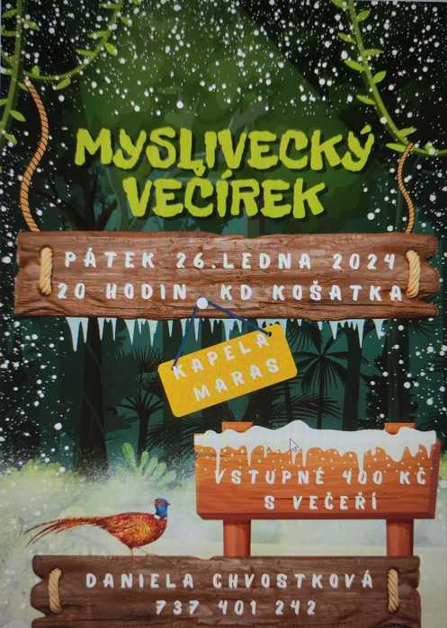 Myslivecký spolek SOUTOK Košatka Vás zve na Myslivecký večírek, který se bude konat 26. 1. 2024 od 20:00 v KD Košatka. Hraje kapela Maras, vstupné s večeří 400,- Kč. Kontakt p. Daniela Chvostková 737 401 242.