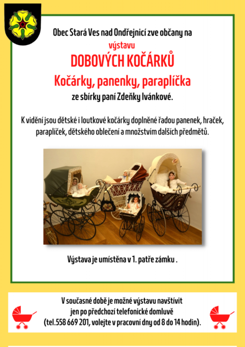 Obec Stará Ves nad Ondřejnicí zve občany na výstavu dobových kočárků - Kočárky, panenky, paraplíčka ze sbírky paní Zdenky Ivánkové.